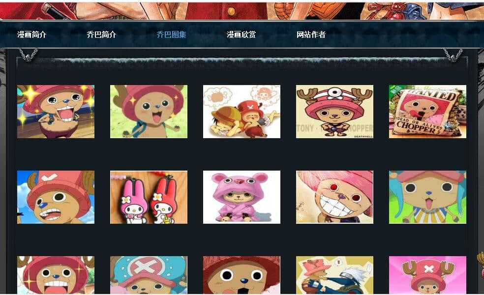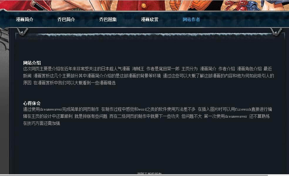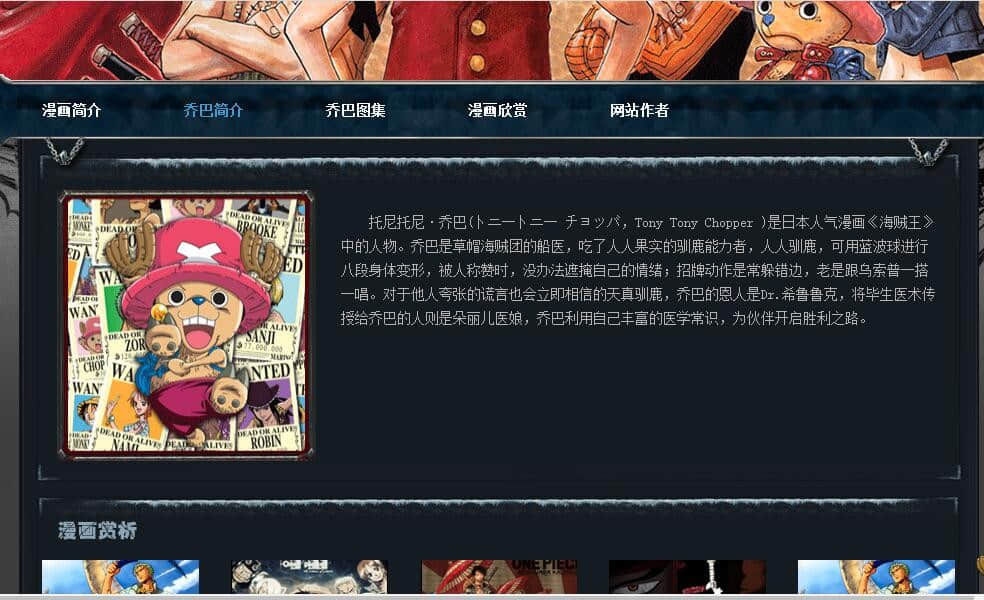 乔巴专题5页 可修改,需要的伙伴们可以联系,网站采用DIV+CSS 布局,使用Dreamweaver软件制作。 |
