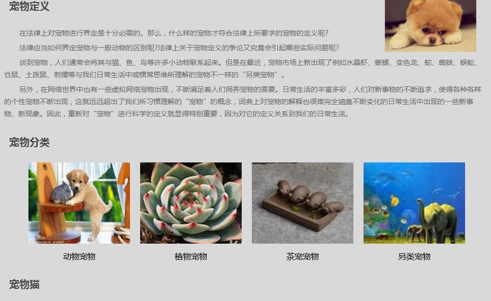 宠物百科单页,采用简单的布局,适合初学者。使用|Dreamweaver软件制作 |