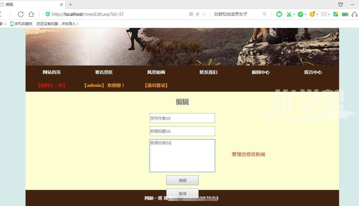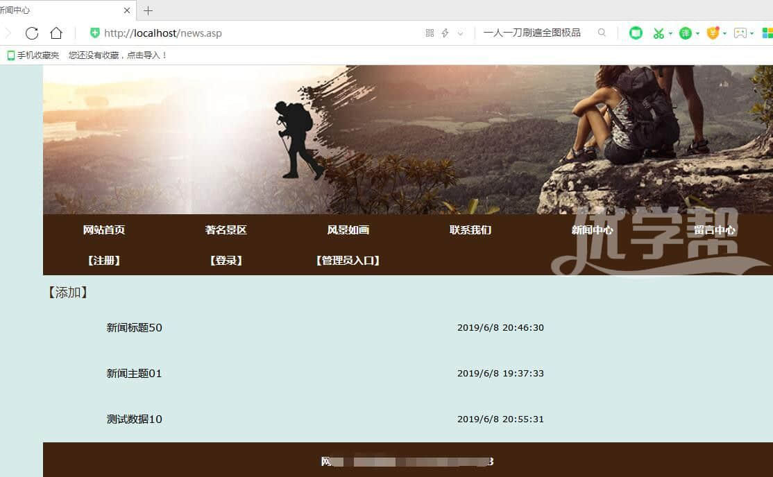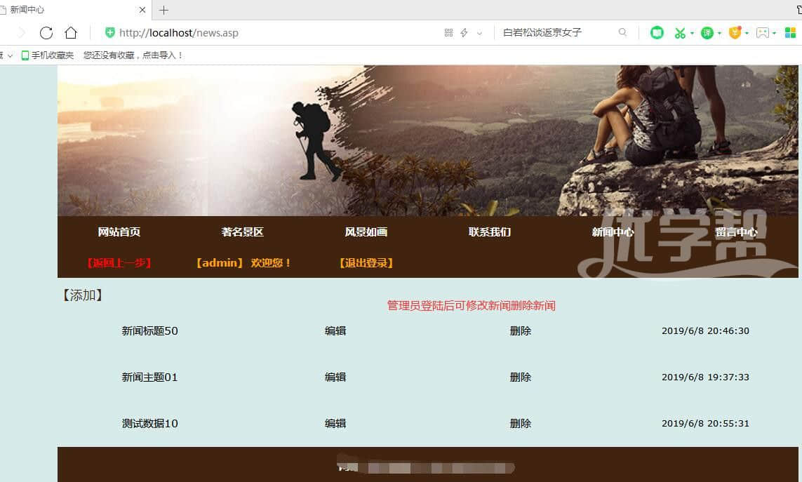 登山运动asp网站,增删改查,后台管理新闻,所有asp网页文件请看截图。数据库是access后台语言是asp。 |
