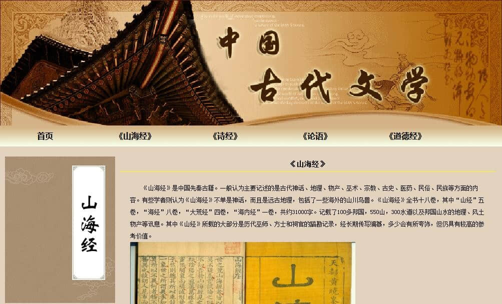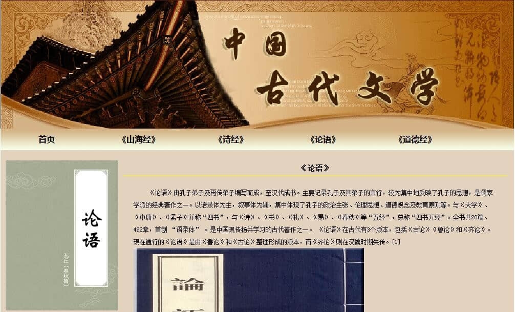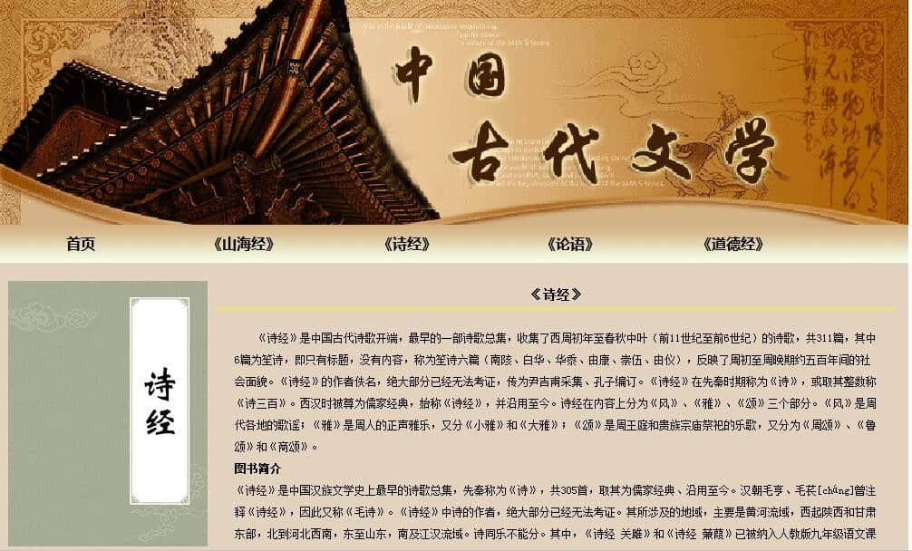 古代文学网站5页,使用div+Css布局,首页上中下的结构,内页简单。适合初学者。 |