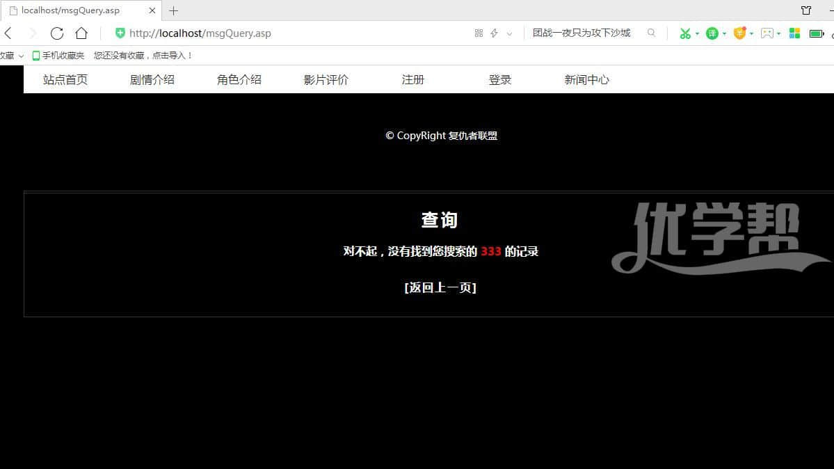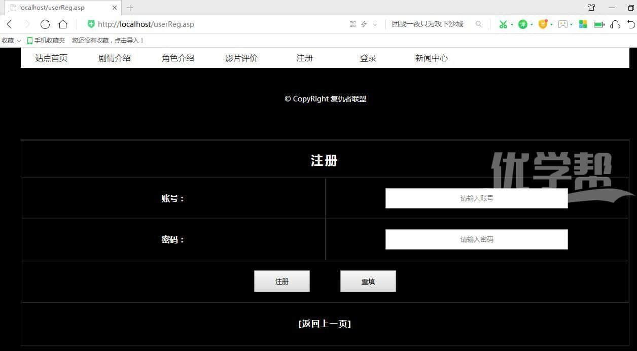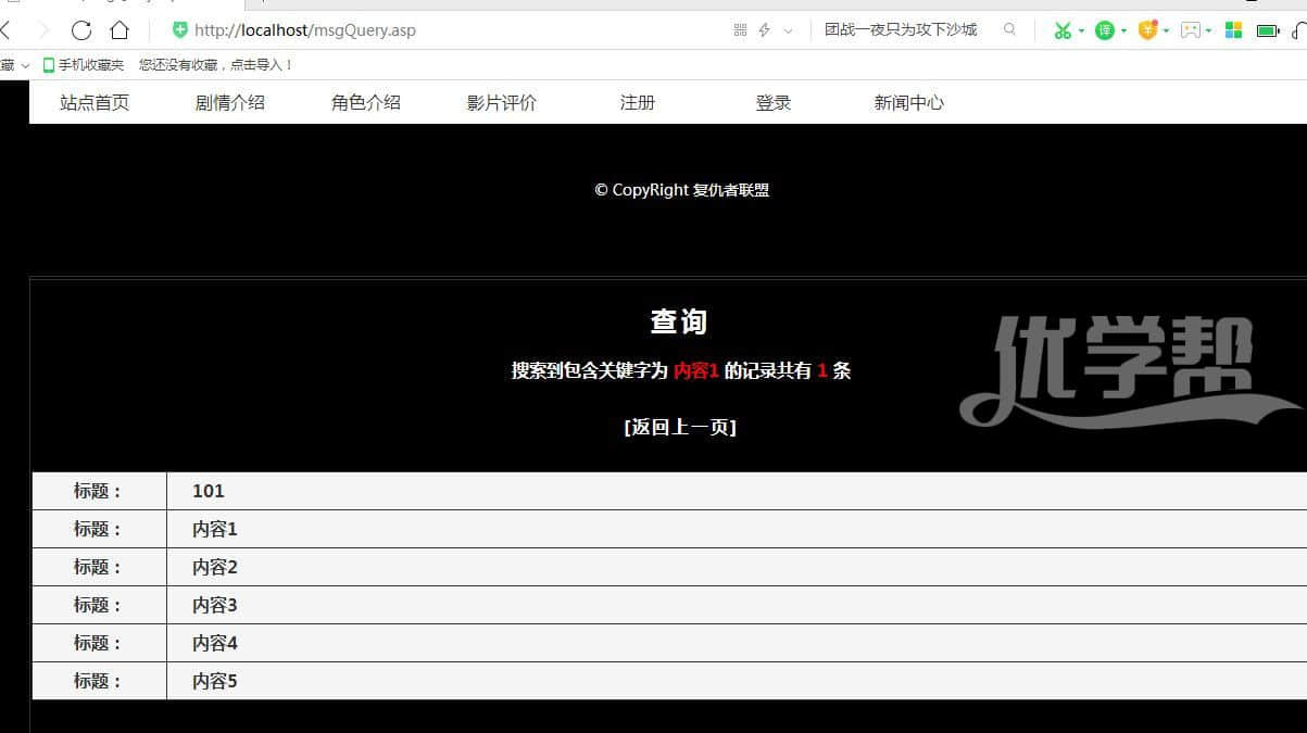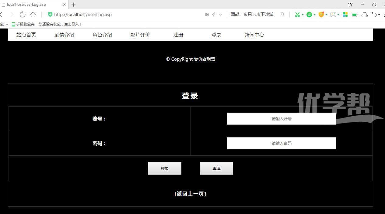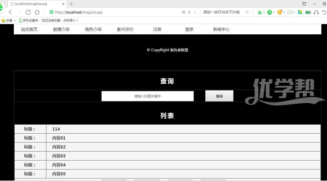 复仇者联盟 ,增删改查,登陆注册,搜索新闻,,修改删除新闻asp+access 数据库是access 后台是asp语言。布局简单,适合初学者。 |