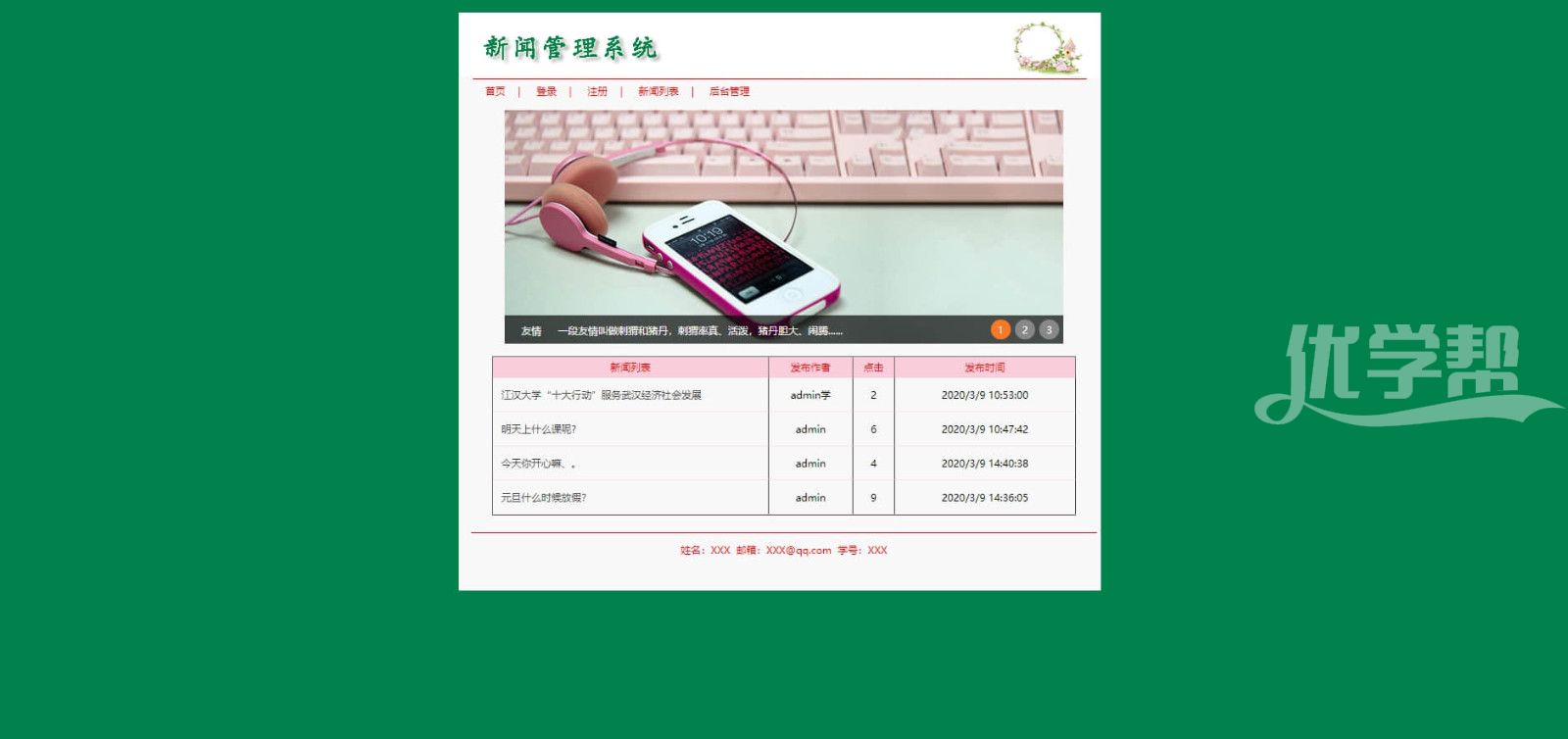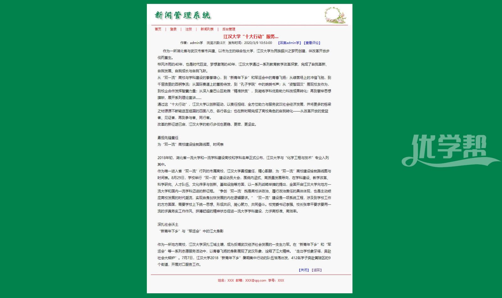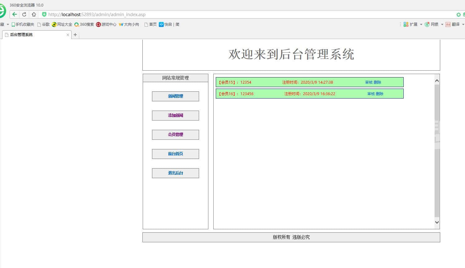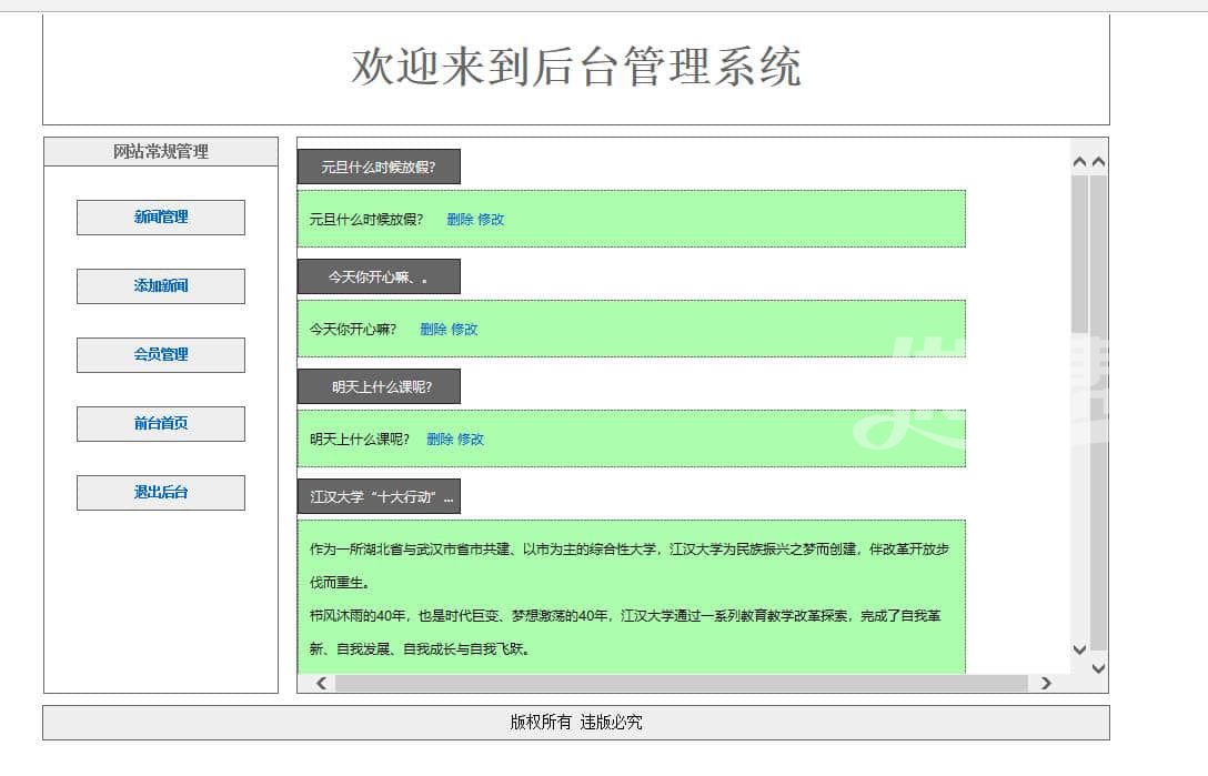 新闻管理系统 登录注册增删改查。主要功能。会员注册用户后登录网站可以评论新闻。后台管理员可以管理会员,管理新闻发布新闻 删除新闻 后台语言是asp 数据库是access |