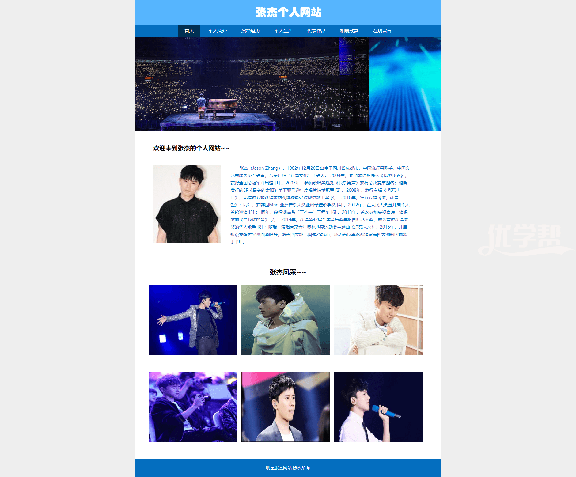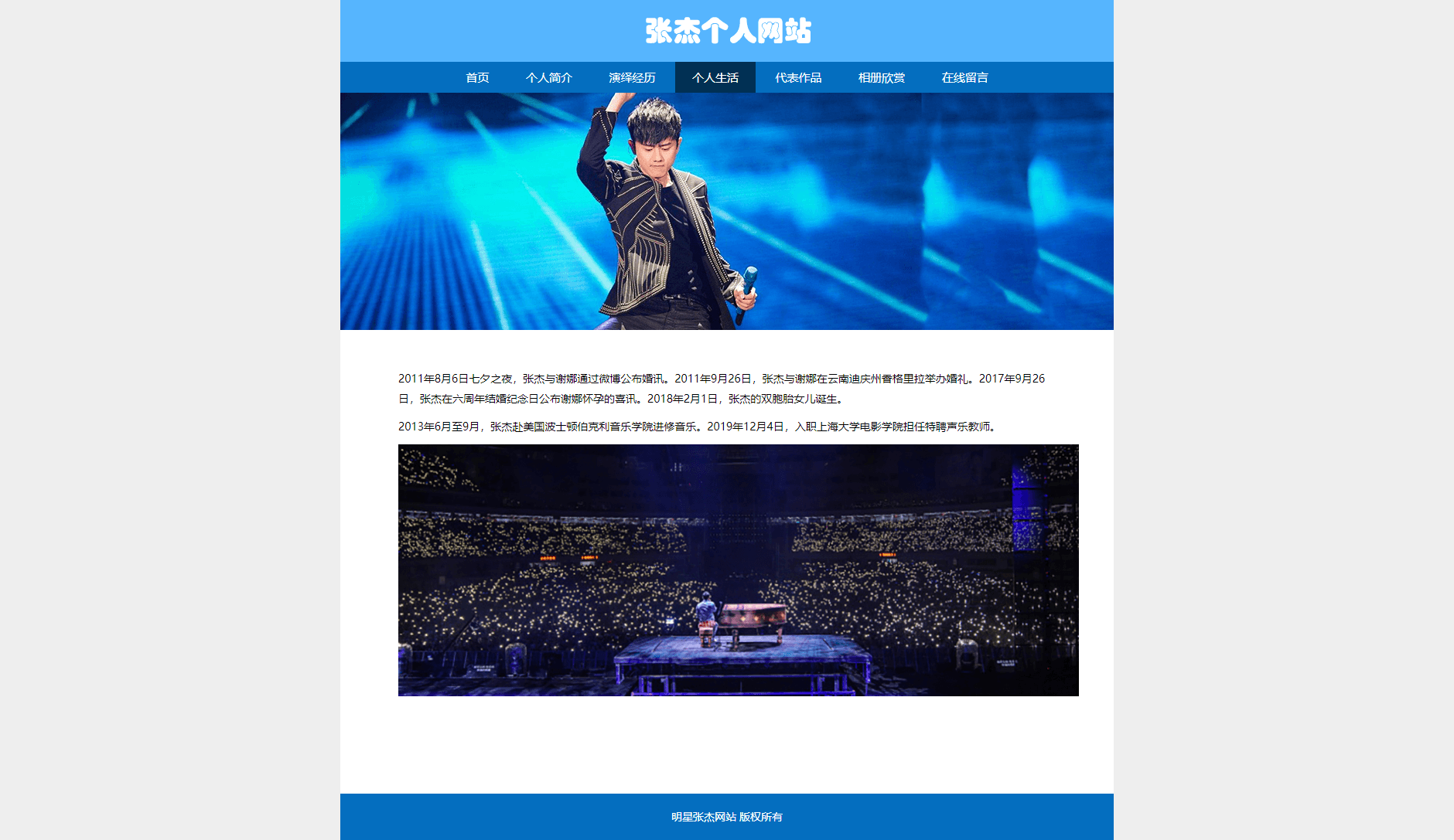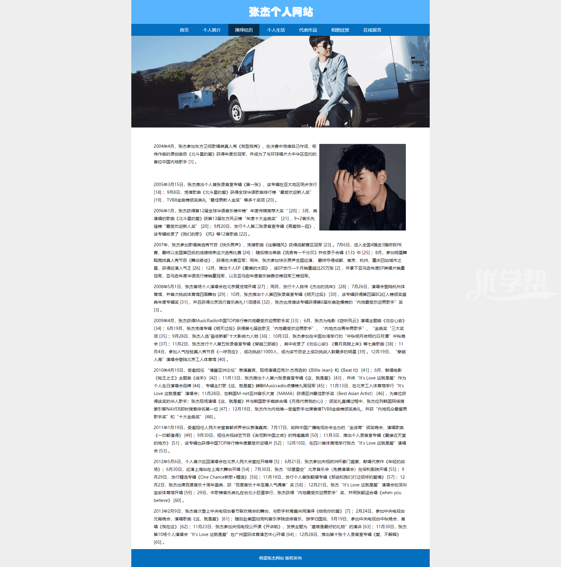明星张杰网站,布局简单7页,使用dw软件制作 |