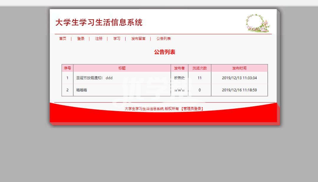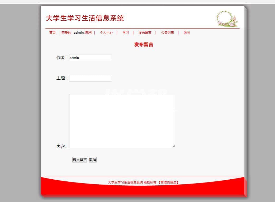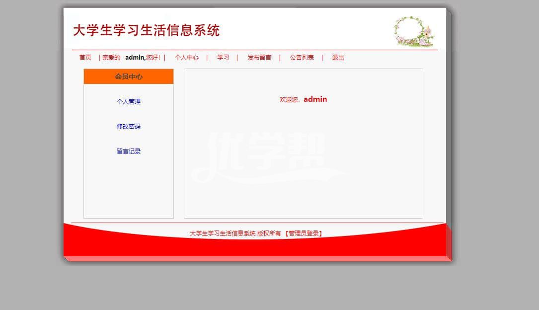 大学生信息生活系统 ,后台语言asp 数据库是access。主要功能有: 登录注册留言 后台管理 会员管理 个人中心 ,添加删除学习资讯,管理留言等 |