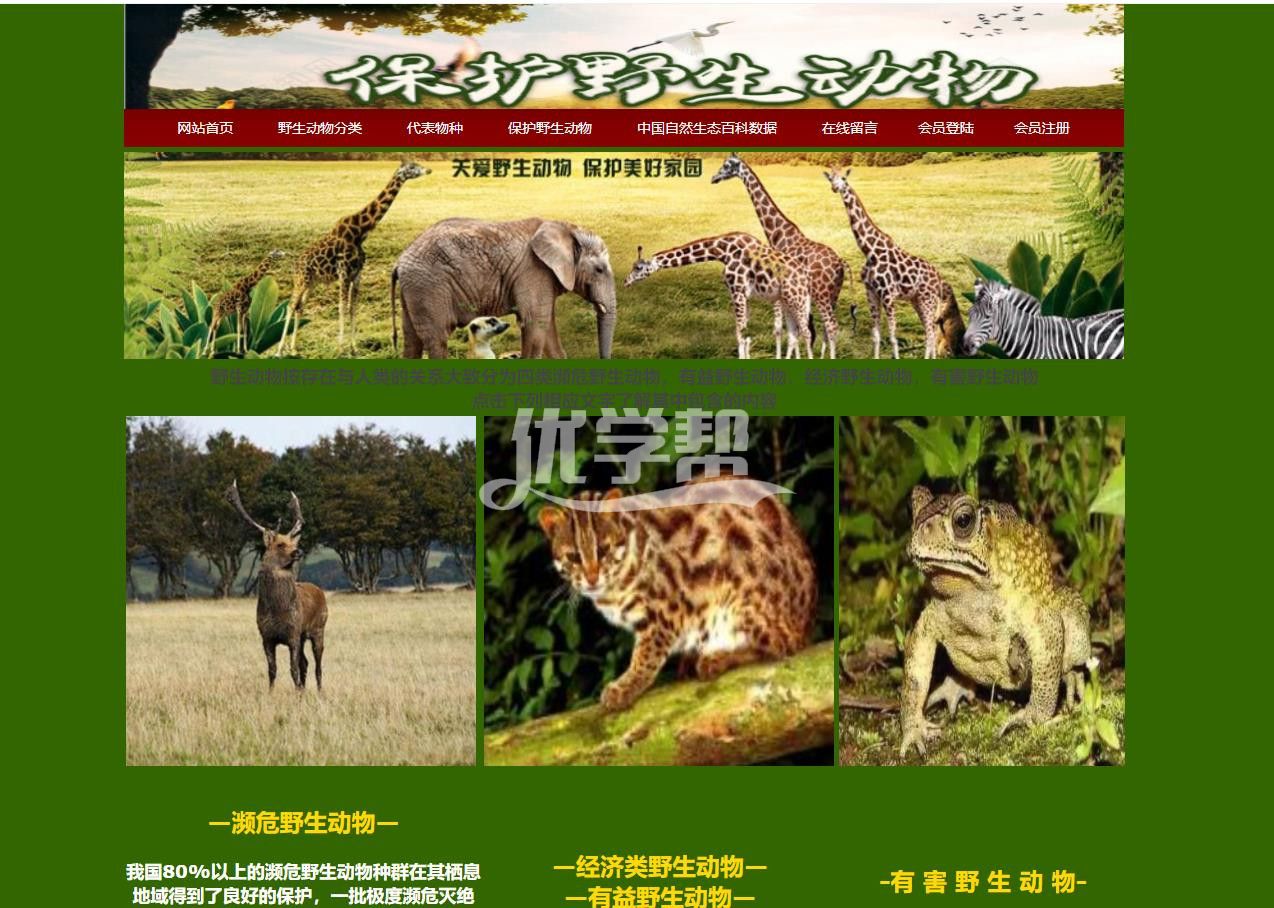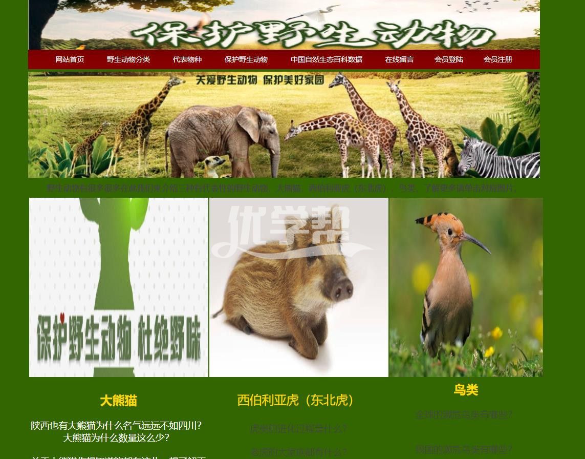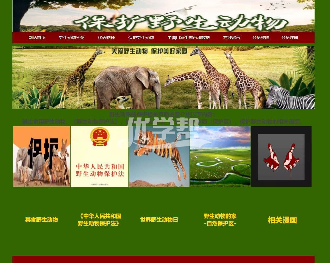 环境保护动物网站 26页。使用了div+Css布局和table表格布局,网页非常检查,带有背景音乐,适合初学者,由于网站页数比较多,只展示部分页面,详细文件可见截图文件夹 |