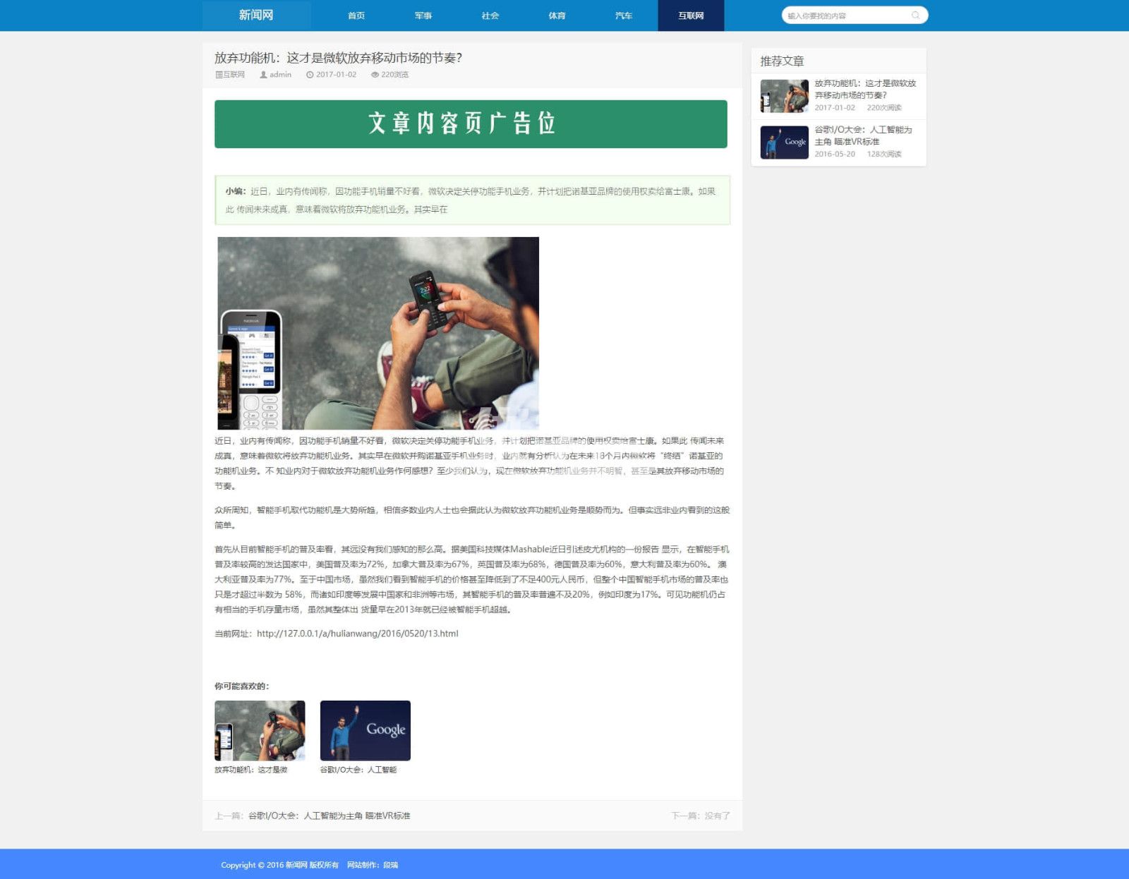 织梦模板做的新闻网,php+mysql,购买的时候要看看是否允许使用织梦模板做后台。适合毕业设计和期末大作业,购买后邮件发送安装教程和软件下载地址,如不会安装我们提供付费处理。 |