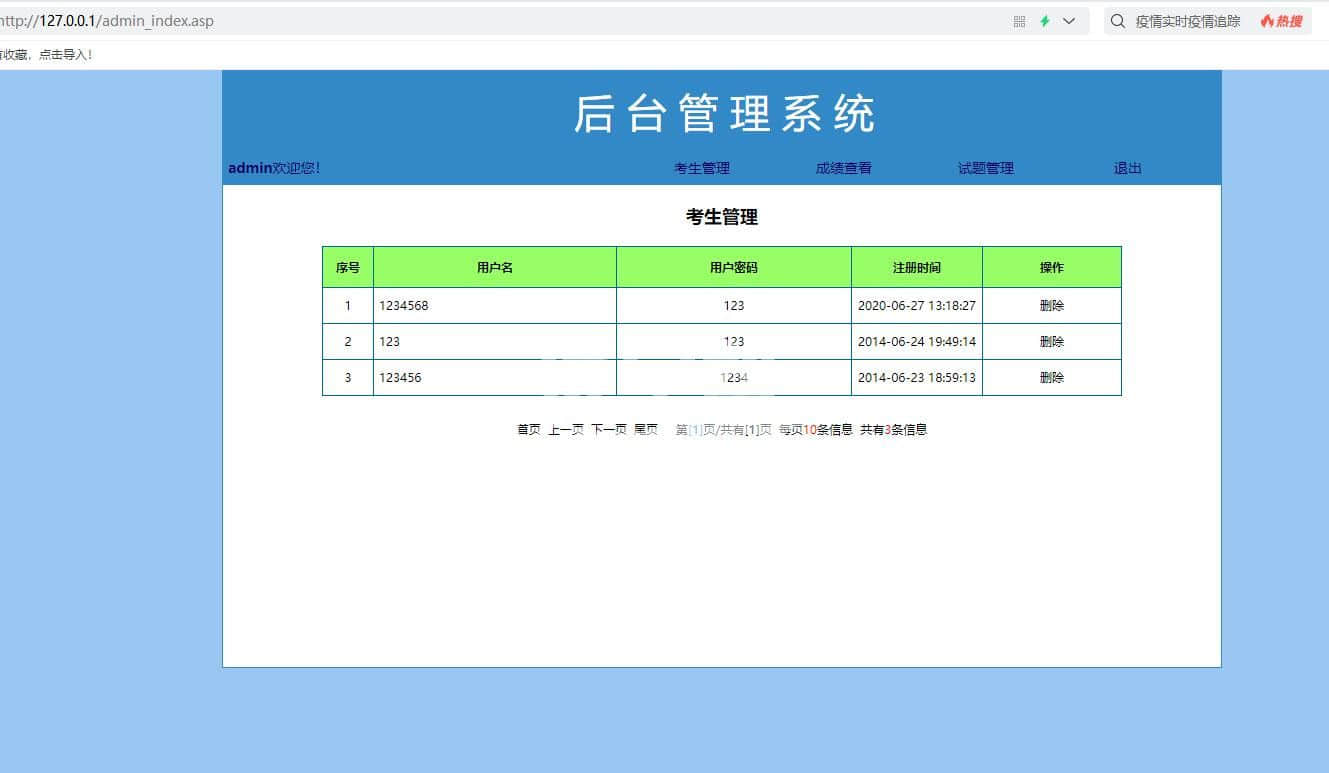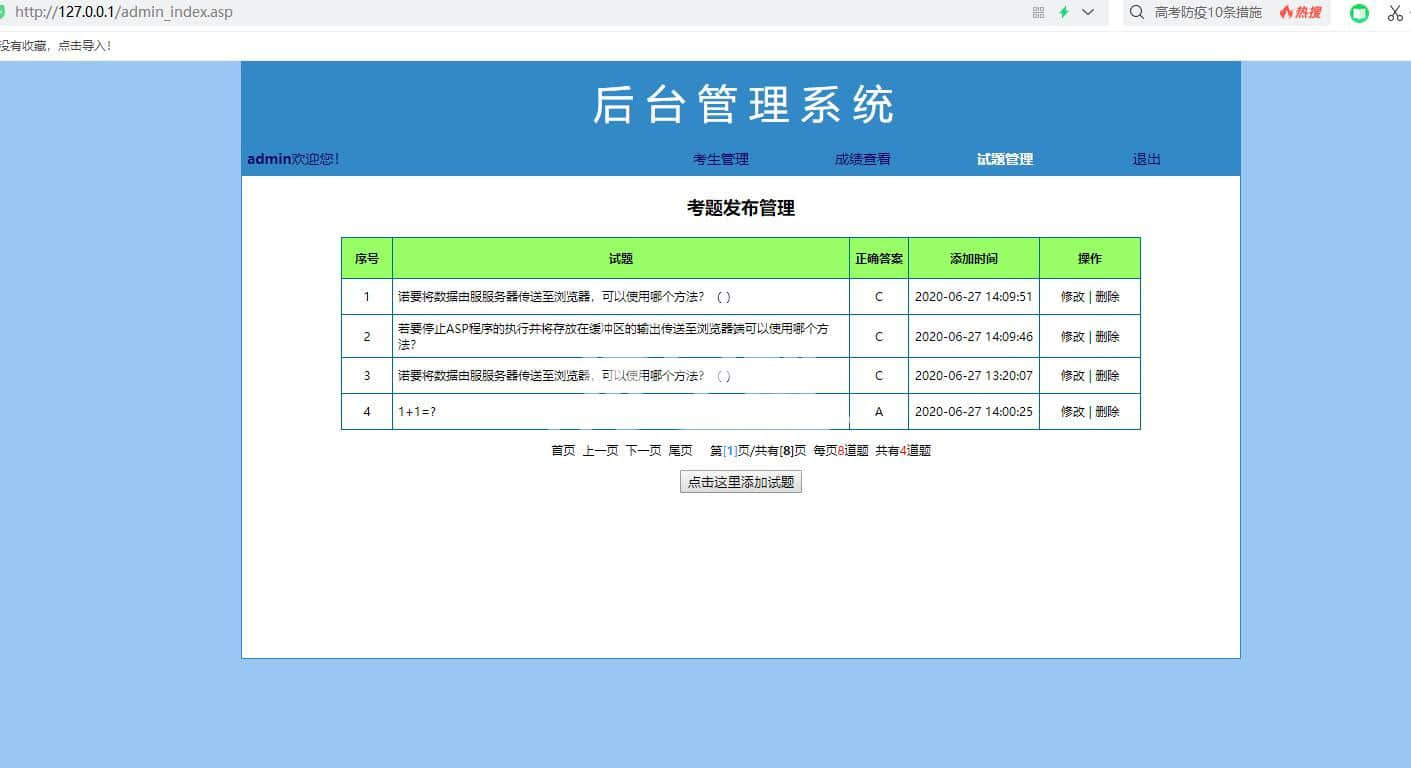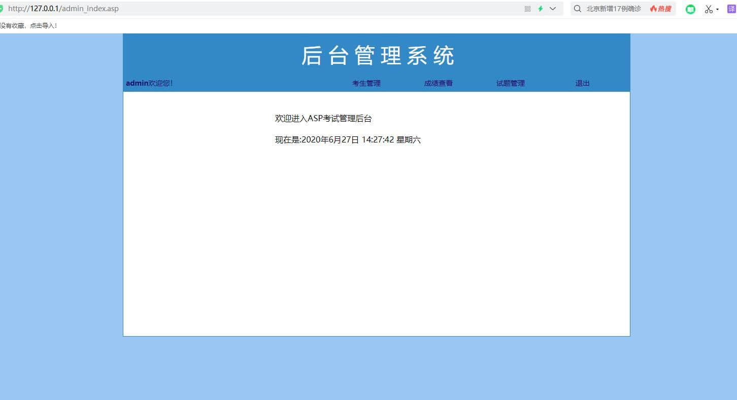 asp+access制作的考试管理系统,登陆注册后台 分为前端和后端两个部分。前端需要考试登陆才能考试,考完试自动出成绩。没有账户可以注册。后端管理员登陆后,可以管理试题、管理成绩、已经管理考试账户。适合asp动态网站初学者。 |