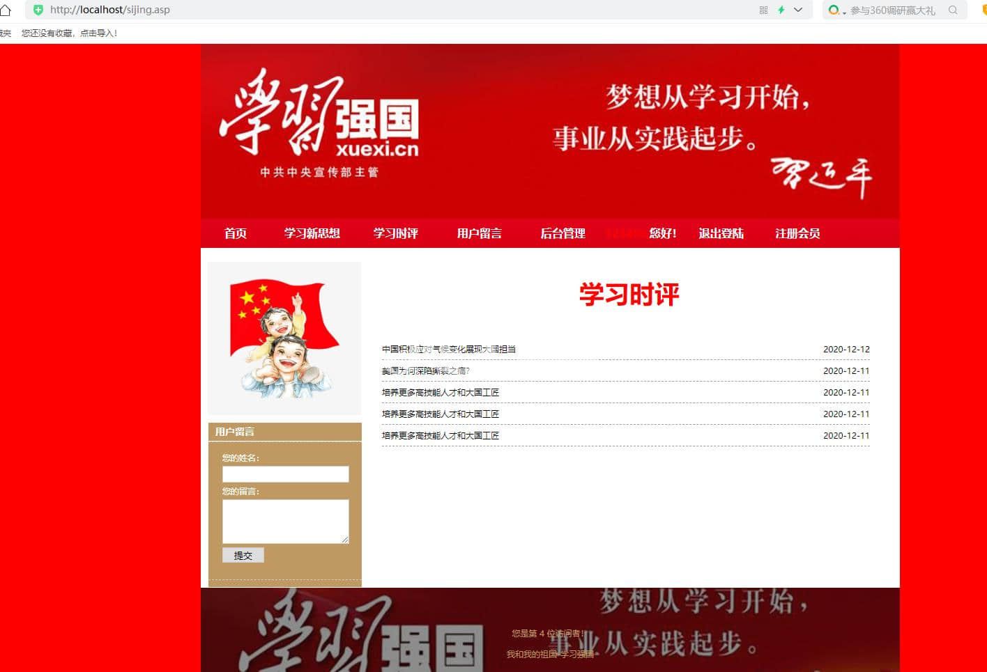 学习强国登陆注册留言,后台管理会员管理留言 ,数据库是access。后台语言asp。主要功能是:登录注册留言,后台管理留言 、管理注册会员。网站带js轮播图效果、网站访问人数统计 |