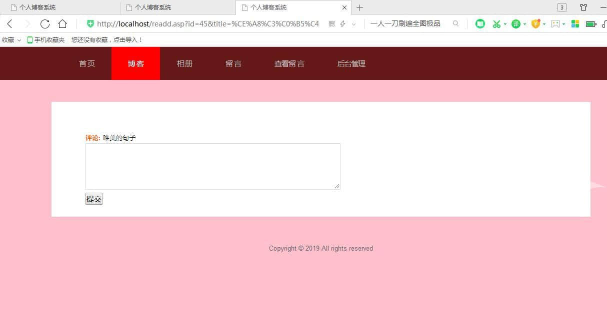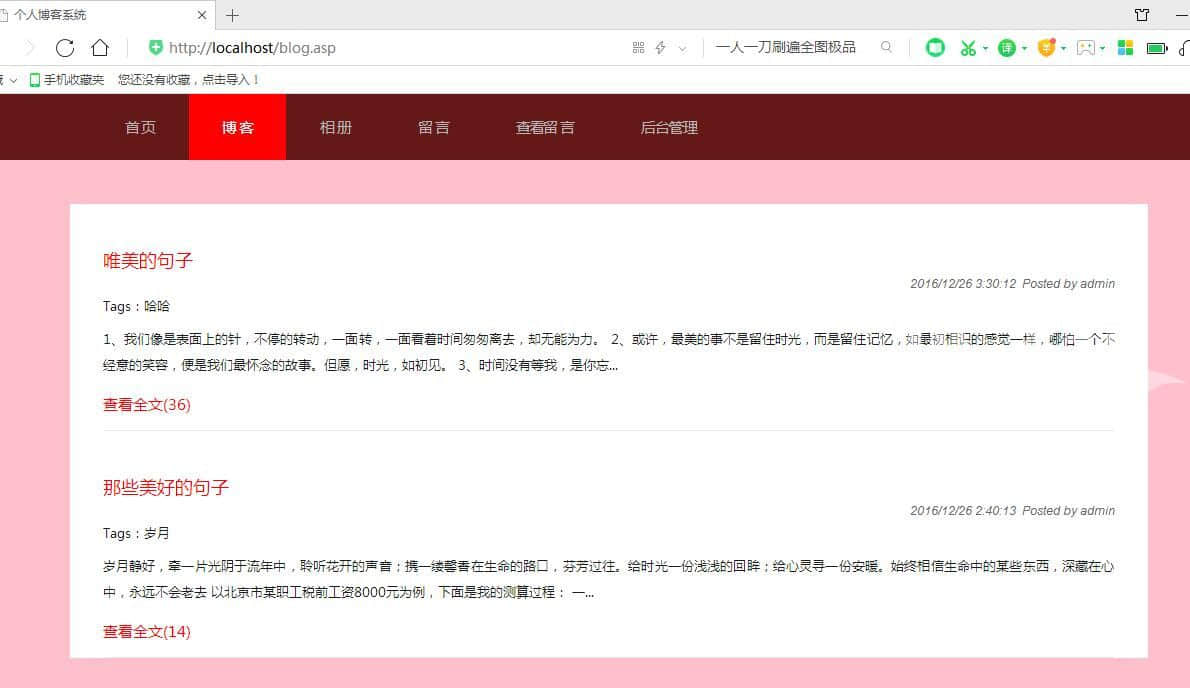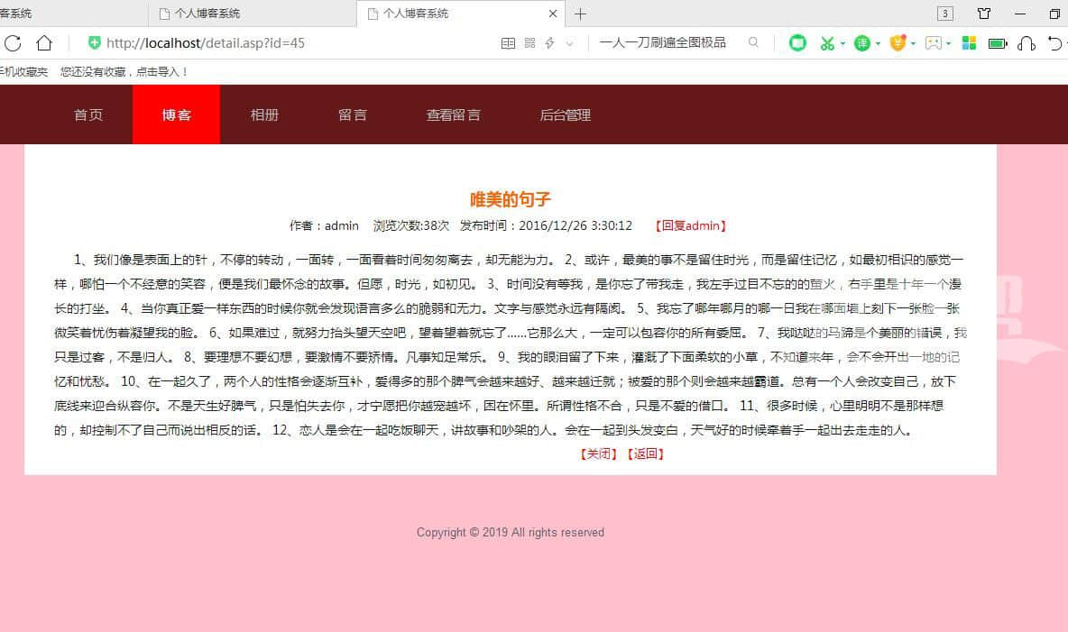 个人博客女生版本,布局简单。数据库是access数据库。后台语言是asp,有发布留言查看留言,相册功能 回复文章功能,后台管理功能,发布文章,删除留言,管理文档功能。还有另外一个版本 |