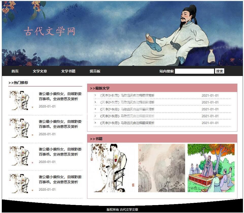 古代文学网站5页,使用div+Css布局,首页上中下的结构,内页简单。适合初学者。